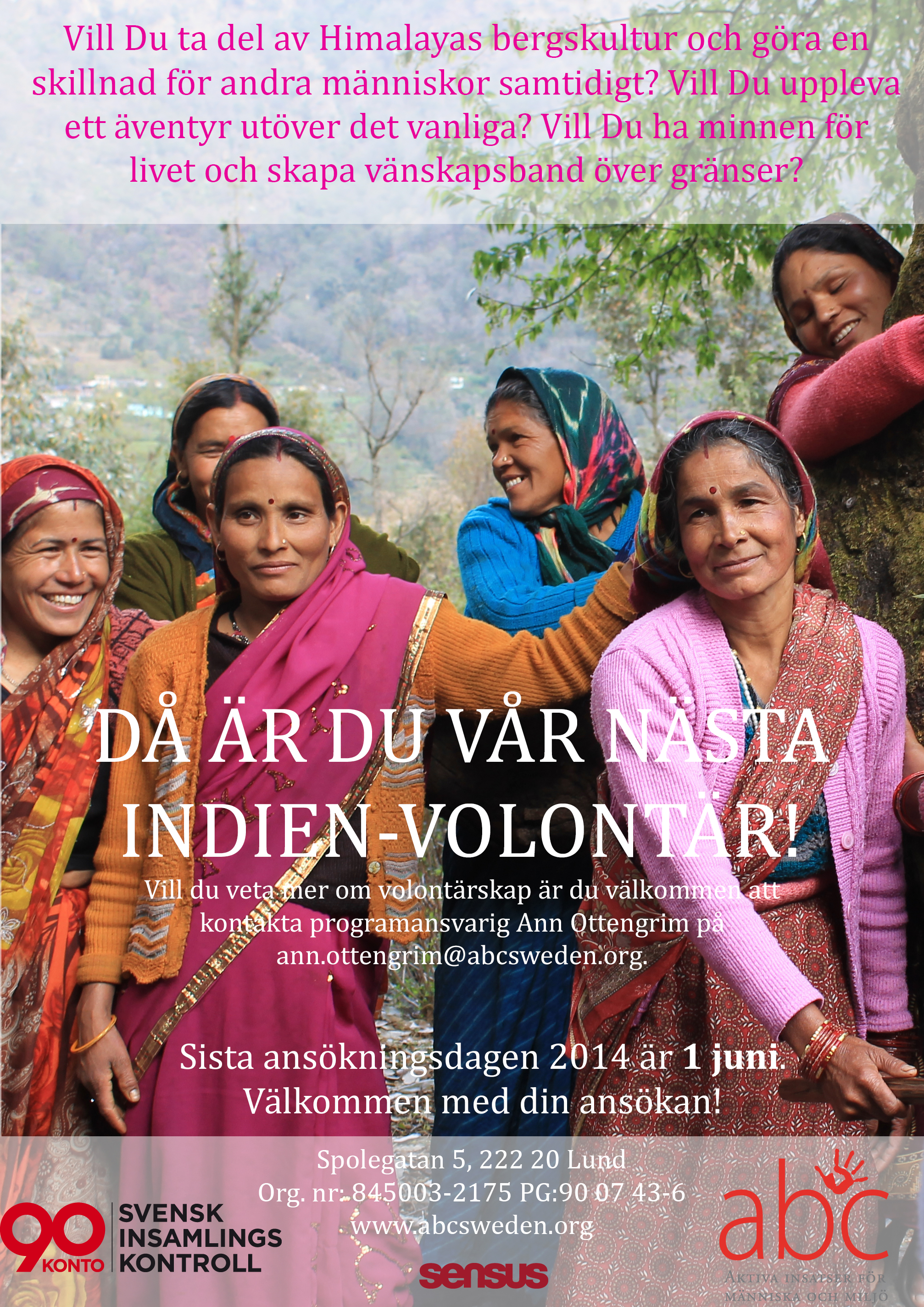Learn about the strong Indian culture and how people in the mountain villages in the Himalayas live. Become a part of the positive change, the shift, that is happening in India as we speak by involving yourself as an India volunteer within ABC. Widen your views of the world around you – send in your application to ABC’s Volunteer Programme coordinator Ann Ottengrim at ann.ottengrim@abcsweden.org!